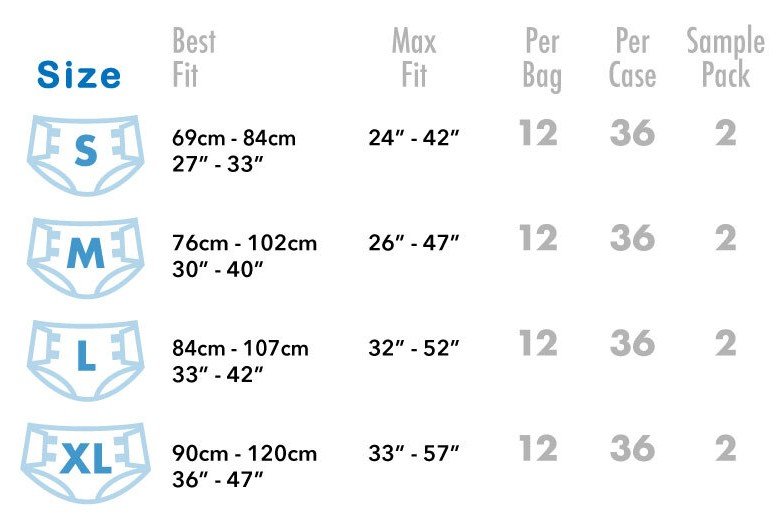 2 diapers per sample, 12 diapers per bag, 3 bags per case (36 diapers)