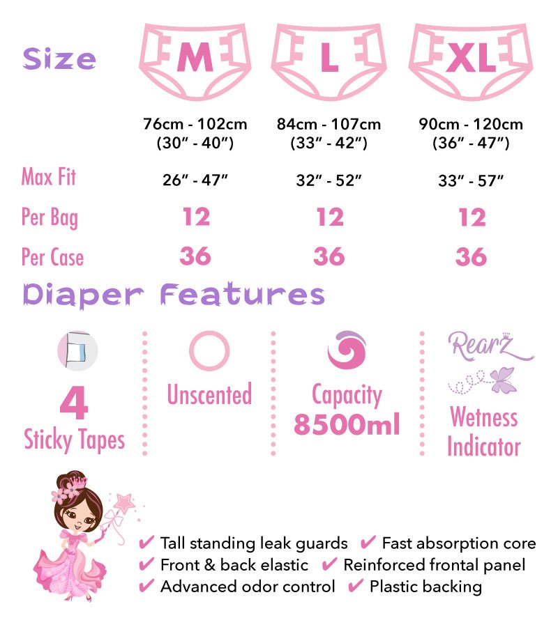Get ready to some cheer your daily incontinence management routine with our Princess Pink adult diapers! This isn't your ordinary, run-of-the-mill diaper – oh no! With its super high capacity of 8500ml, you can rest assured that you'll be protected against leaks and accidents while feeling confident and secure. Full coverage padding protects against leaks in all positions.